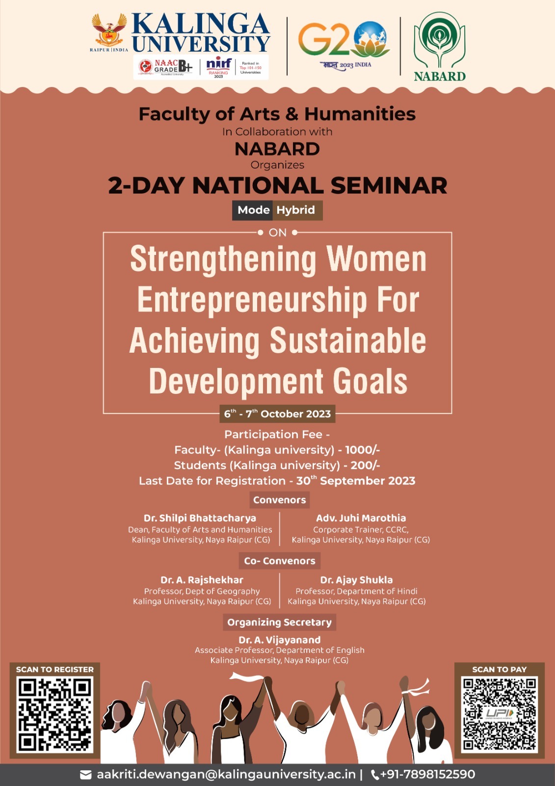 Faculty of Arts and Humanities, Kalinga University in collaboration with NABARD organized 2-day National Seminar on “Strengthening Women Entrepreneurship for Achieving Sustainable Development Goals”. Inauguration of the ceremony took place at Kalinga University Auditorium in presence of eminent guests including Padma Shri Phoolbasan Bai Yadav, Indian Social Worker and Founder of the Maa Bamleshwari Janhitkari Samiti as chief guest.