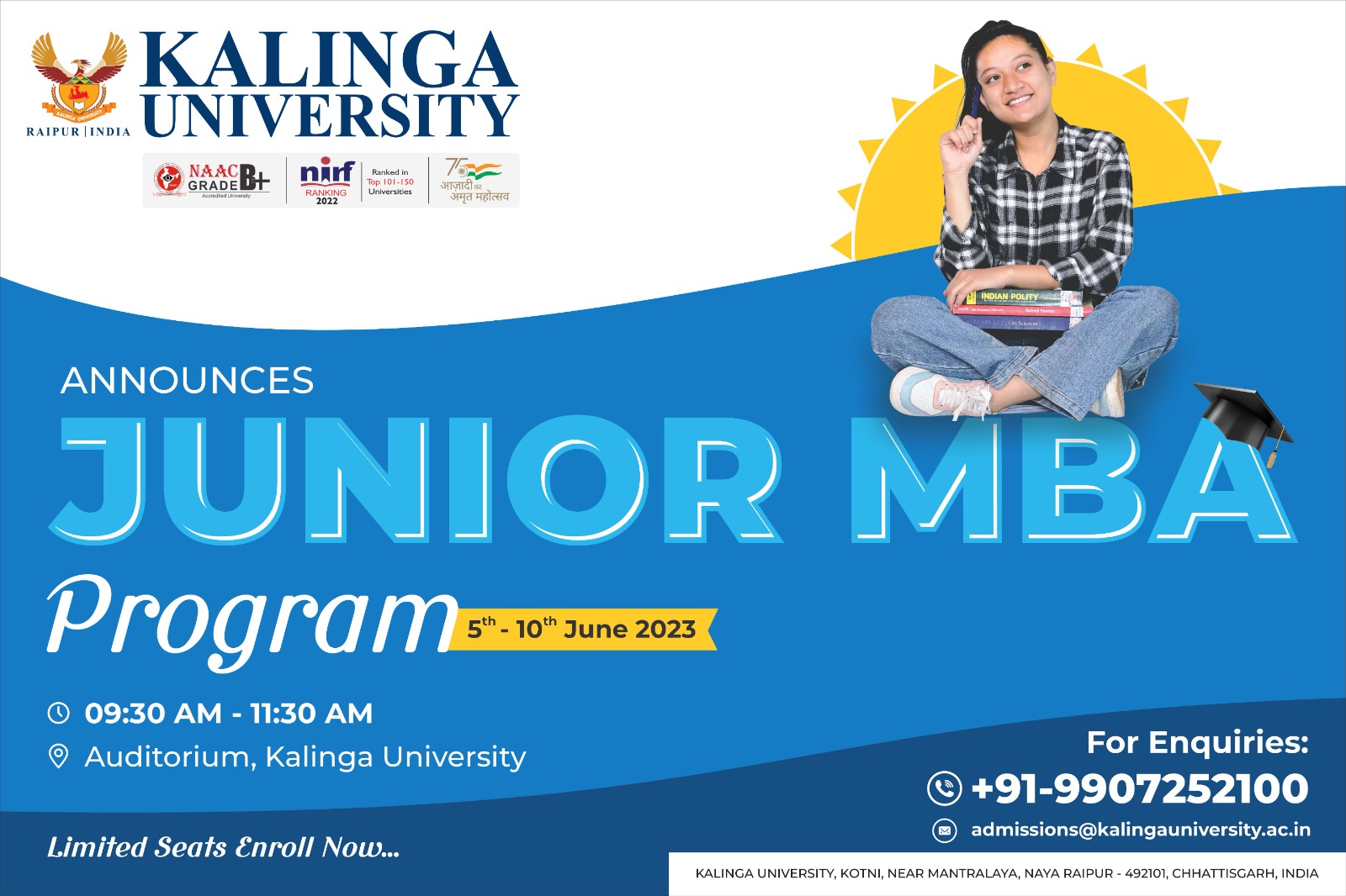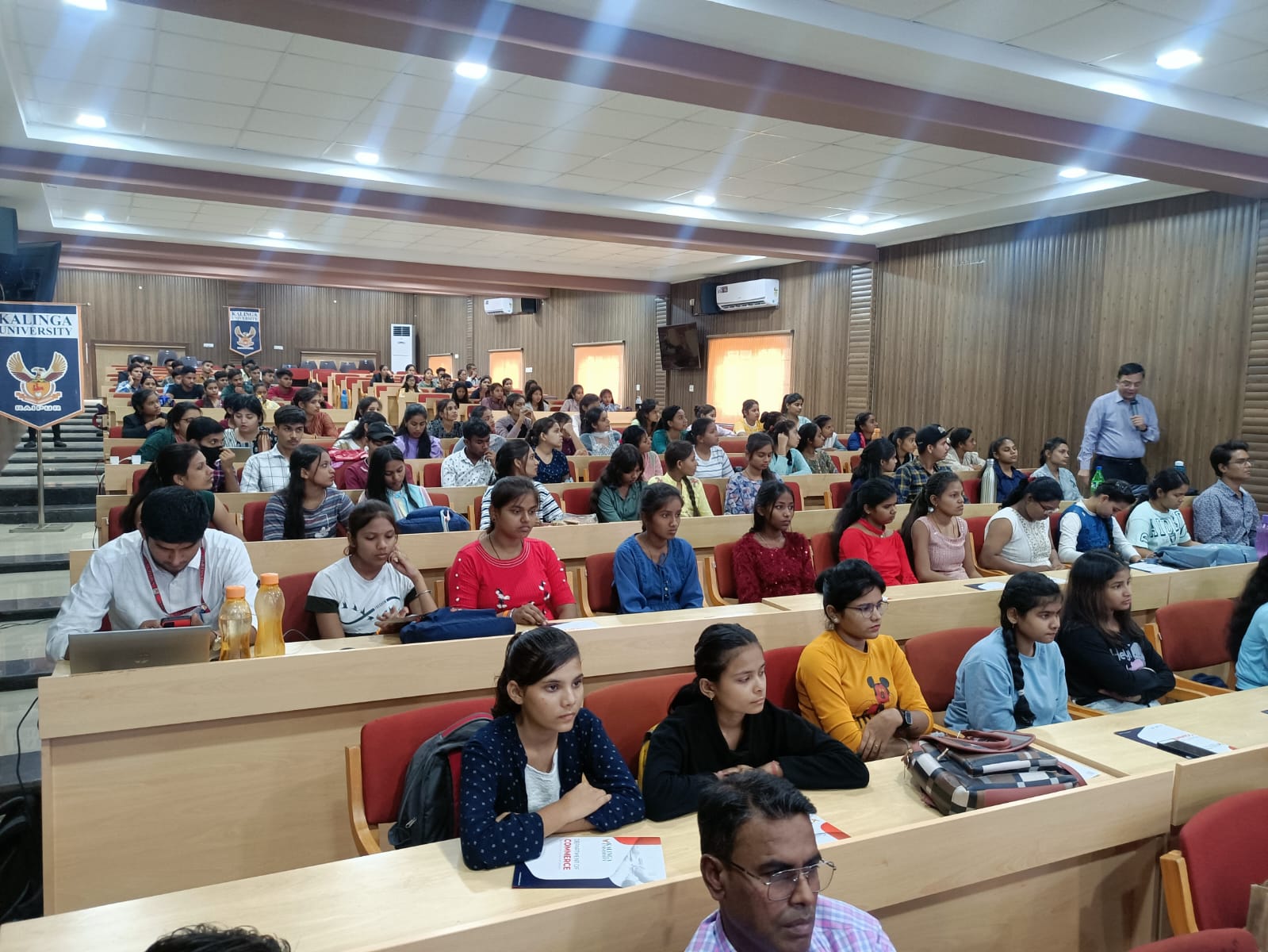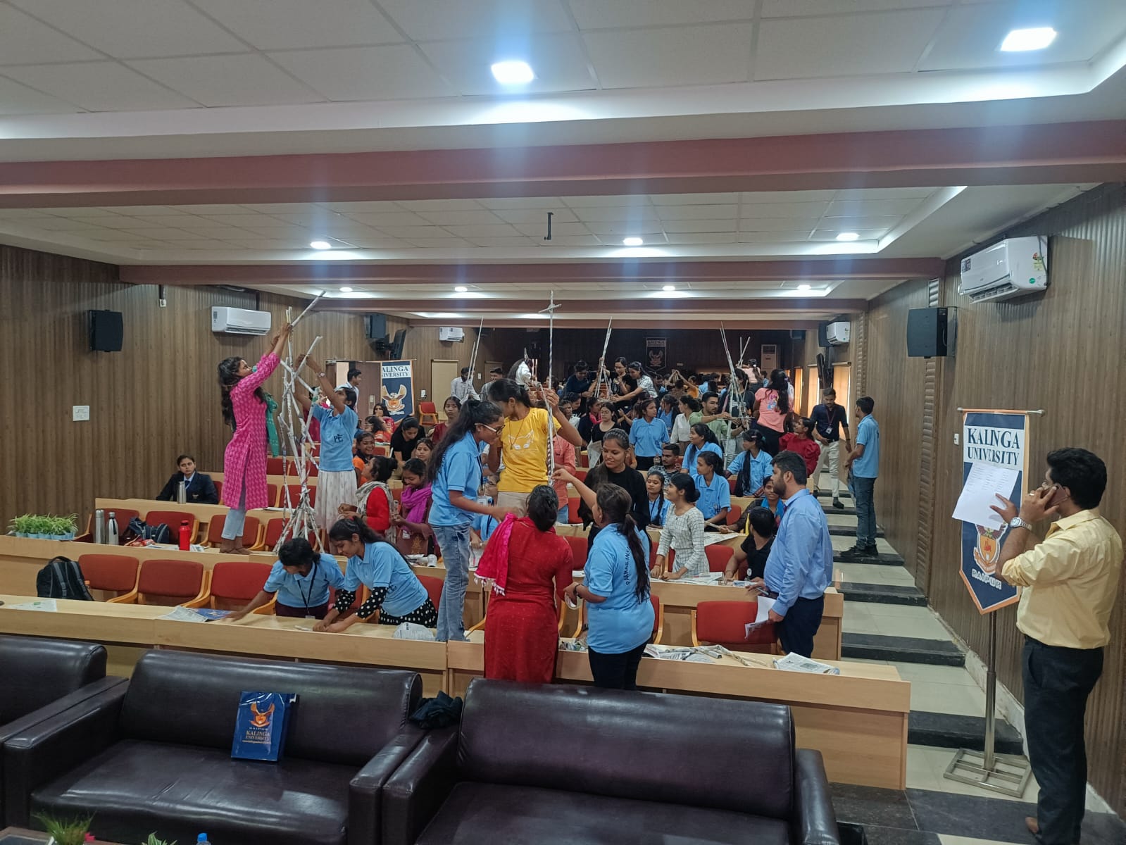 Junior MBA Programme Organized at Kalinga University Faculty of Commerce and Management in coordination with Dean Students Welfare of Kalinga University successfully organized Junior MBA program. Junior MBA is a new concept introduced in Chhattisgarh for the first time by Kalinga University. In this, students who have just qualified class 12th or who are studying in class 12th are provided with in depth information about the opportunities and challenges related to management field. This is done through lecturers, role plays, case studies and several interesting management games and quiz contests. Large numbers of students from Raipur, Durg and neighboring districts took part in the session. Session was organized from at Air Conditioned Auditorium of Kalinga University, Naya Raipur. Students took part in various fun filled activities and were awarded certificates on the concluding day by the university authorities. The first day session was attended by over 85 students and Registrar of Kalinga University Dr Sandeep Gandhi gave welcome address. He informed about the idea behind the five days long session of Junior MBA organized for the first time and extended his best wishes to the participants. First session was addressed by Mr Alakshendra Mogre, Motivational speaker and trainer and second session was team building activity where participants build paper tower’s with limited resources. On the day two first session was taken by Director General, Dr Byju John on ‘How to become Rich? ’ On the same day second session was on Reel making competition on the theme ‘Kalinga Life’ where by participants created reels in University campus and posted it on their instagram, tagging universities officials page. The group is getting huge numbers of likes and views. On the basis of number of views winners were decided and awarded on the concluding day. During day three the first session was addressed by Mr Pankaj Tiwari, Director Corporate Relations and second session by Vice Chancellor, Dr R Shridhar. He presented overview of Kalinga University. Third session of the day was ‘Squid game’ and participants played the game based on the instructions given to them on group basis. On day four first sessions was addressed by Dr Jasmine Joshi, Dean Student Welfare (DSW) on ‘Management Lessons from Bollywood’ and second session was fun filled ‘Treasure Hunt’ played in the university campus. Third session was ‘Open Mic’ the participants performed various activities like, Solo Dance, group Dance, poetry, story-telling and Mimicry. Finally the day five started with fun activity where students played Guess the Brand, movie and riddles followed by lunch and valedictory. The winners of all the activities were felicitated in the presence of Vice Chancellor, Dr R Shridhar and Ms Shinki K Pandey, Head of Department of Management and Dr Sampada Bhave, Head of Commerce Department. Faculties present were Dr Komal Gupta, Mr Debasis Mohanty, Mr Ram Girdhar, Ms Swati Tiwari, CMA Sujata, Anchoring was done by Ms Riya Goel and Mr Satvik Jain. Marketing team members active during the event were Mr Yash Sharma, Mr. Mohammed Taukir, Mr Yashvant Janghel, Mr Pankaj and others. Students grooved on the tunes of catchy bollywood songs after they received certificates.
