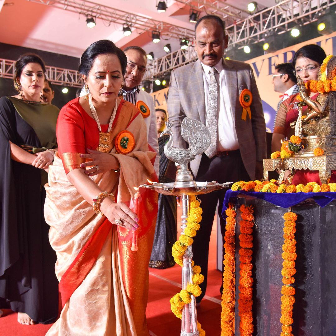 The kaleidoscopic Kalinga Utsav 2022 was celebrated at the university campus on 19th November 2022. Guests were welcomed with the beats of traditional Dhols at the entrance of the university. The program commenced with the lighting of the ceremonial lamp by the Chief Guest, Sh. Ram Kumar Yadav, MLA Chandrapur constituency, in the presence of the dignitaries of the University Chairman – Dr. Rajeev Kumar, Chancellor – Dr. Sandeep Arora, Pro-Chancellor – Dr. Sajjan Singh, Trustees – Dr. Sharmila and Dr. Sima Arora, Vice-Chancellor – Dr. R. Shridhar, Registrar – Dr. Sandeep Gandhi, Head of the Departments, faculties, students and parents. Thereafter, Saraswati Vandana was rendered to gain the favour of the Goddess of Wisdom, Knowledge, and Art. The welcome speech was given by Dr. Rajeev Kumar, Chairman of Kalinga University, followed by a felicitation of guests.