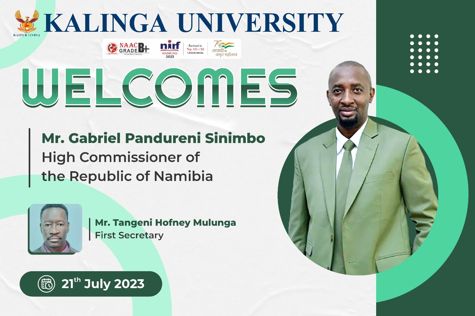Naya Raipur, India – On 21st July 2023, High Commissioner of Namibia, His Excellency     Mr. Gabriel Pandureni Sinimbo and First Secretary, Mr. Tangeni Hofney Mulunga visited Kalinga University, Naya Raipur, India. The purpose of this visit was to interact with Namibian students studying in Kalinga University, and inquire about their well-being and academic experiences.