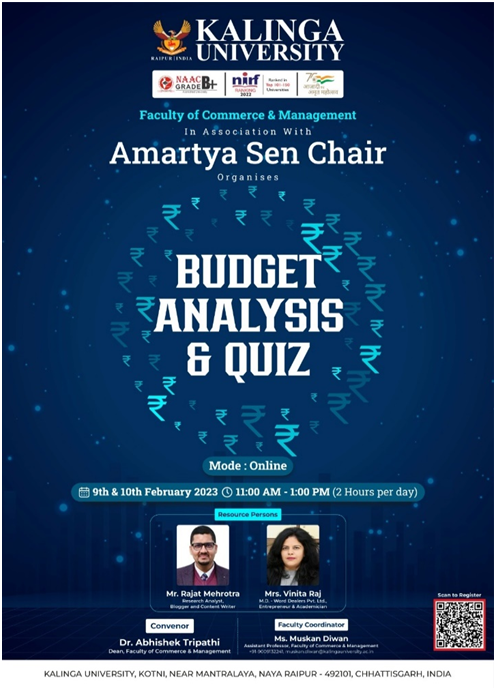 The Faculty of Commerce and Management, Kalinga University, in association with Amartya Sen Chair of Kalinga University, organized two days of Session on “Budget Analysis and Quiz Competition” on 9th& 10th February 2023..